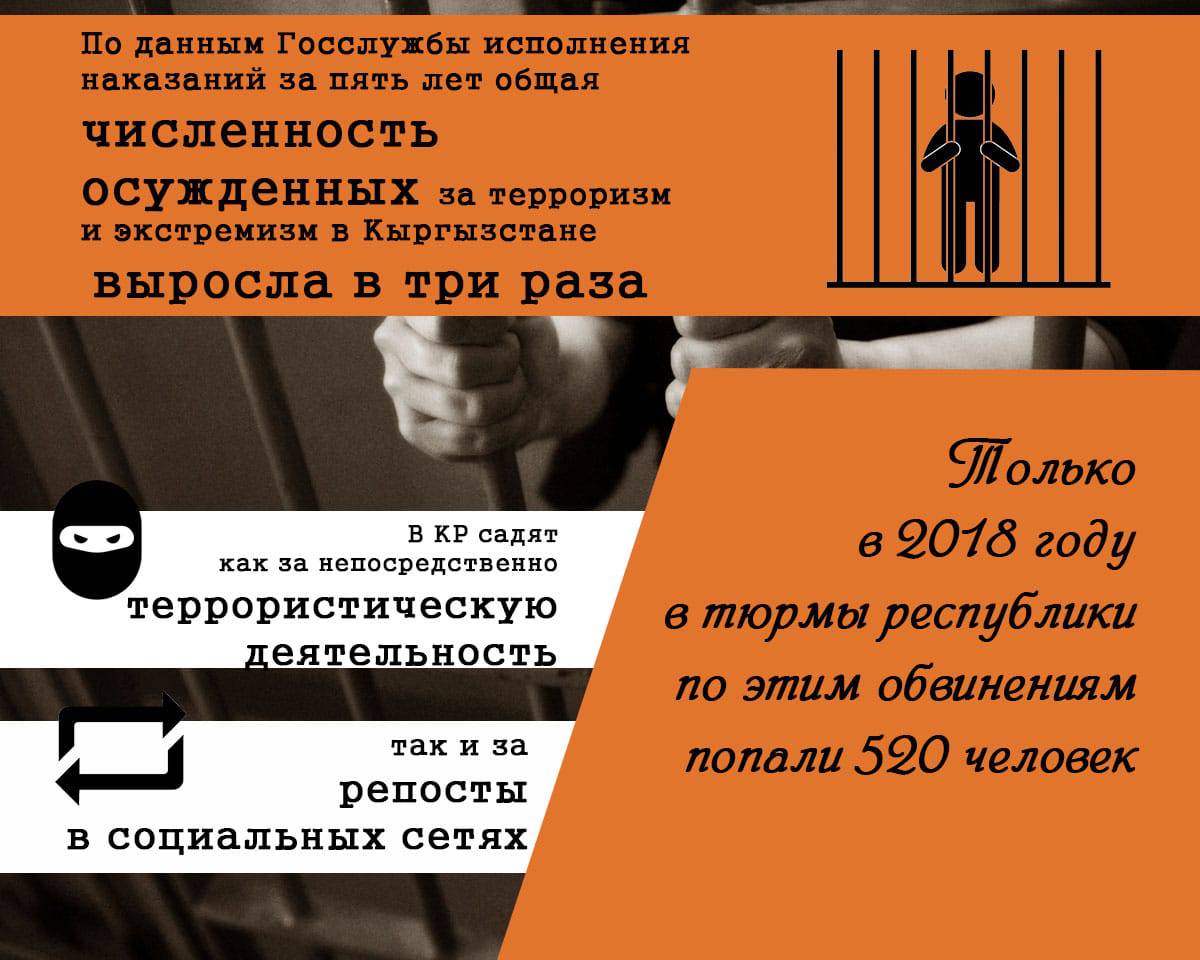 При этом с 2016 по 2018 год по этой статье не назначались условные сроки. 18 декабря 2019 года Управление службы по противодействию экстремизму и незаконной миграции МВД КР сообщило, что с начала года за распространение экстремистских материалов было задержано более 300 человек. Большая часть случаев привлечения к ответственности за хранение экстремистских материалов связана с материалами «Хизб ут-Тахрир». При этом, по данным, которые приводил в 2016 году Верховный суд КР, этнические узбеки составляли более половины из числа осужденных за преступления террористической или экстремистской направленности.